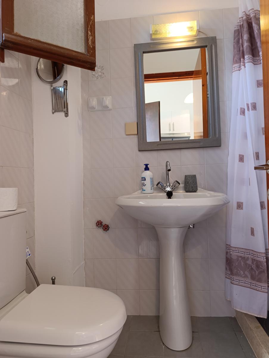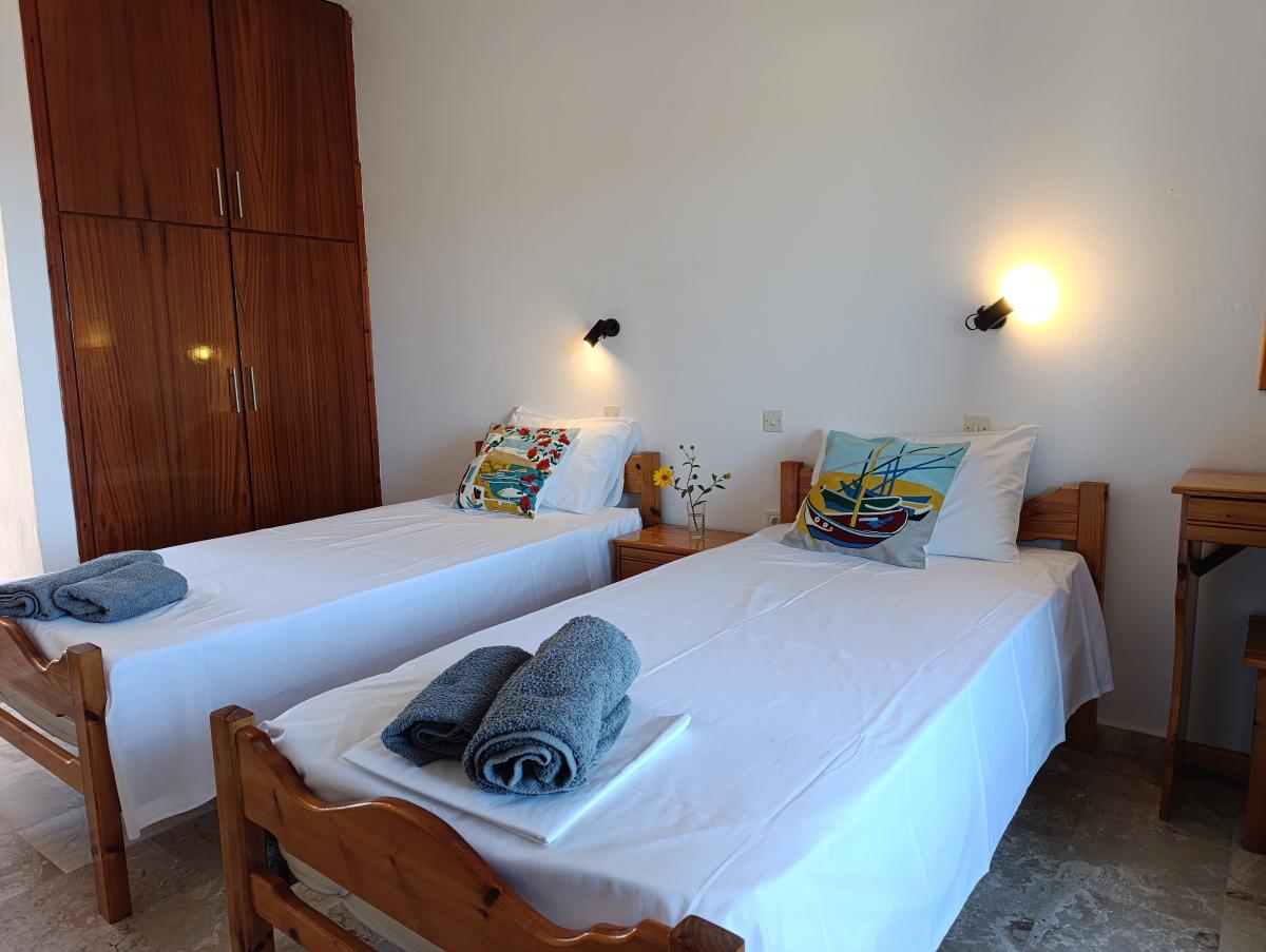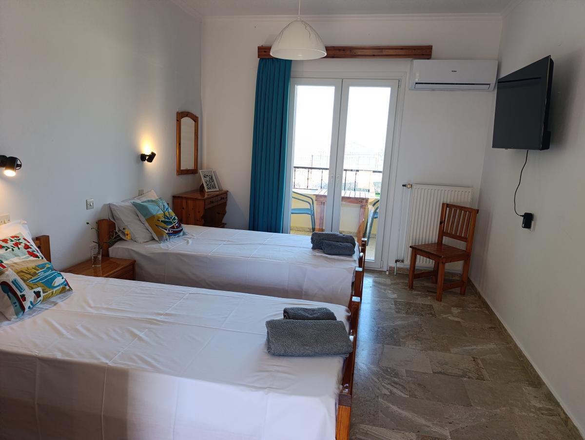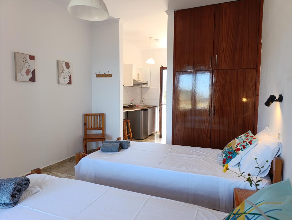 Die sechs Studios liegen allesamt im Obergeschoss und haben daher ausnahmslos einen Balkon mit Meerblick – und auf der anderen Seite einen weiteren – mit Blick über die direkt hinter dem Haus beginnende Olivenhaine und die bewaldeten Berge des Honigtals. Die Studios bestehen aus einem kombinierten Wohn- Schlafraum mit zwei zusammengeschobenen Betten. Die maximale Belegung ist mit zwei Erwachsenen und einem Kind erreicht.