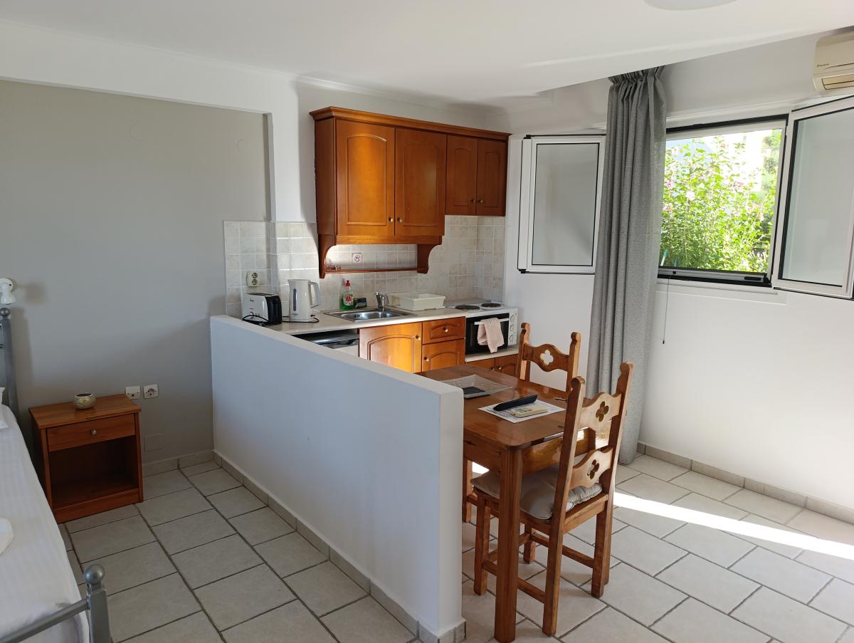 Das Anna Studios bietet zwei grundverschiedene Ferienwohnungs-Typen an: Studios und Maisonetten. All diese 18 Ferienwohnungen sind hell, geschmackvoll und komfortabel eingerichtet, haben auch alle einen eigenen Balkon. Zur Ausstattung gehören stets ein Safe, (mindestens) eine Klimaanlage und ein Sat.-TV. Die kleine Küche jeder Wohnung ist mit ausreichend Besteck und Geschirr, einem 2-Plattenherd mit Backofen, mit Wasserkocher, mit Kaffeemaschine und mit Kühlschrank ausgestattet. Jedes Bad verfügt über Dusche, WC und Fön. Da Mücken ja auf Korfu ziemlich oft ein Thema sind, gibt es vor jedem Fenster und für jede Balkontür ein Insektenschutzgitter.