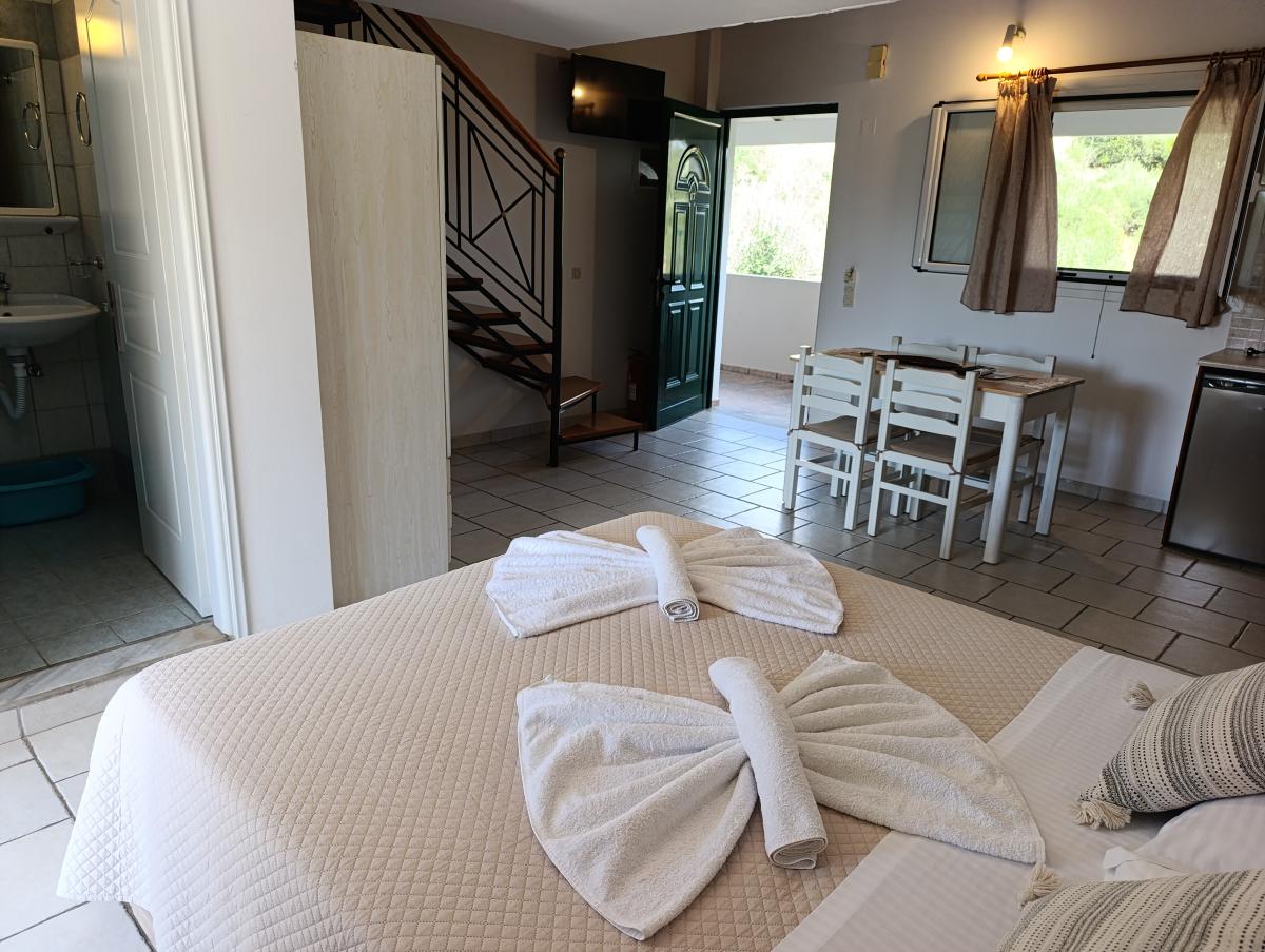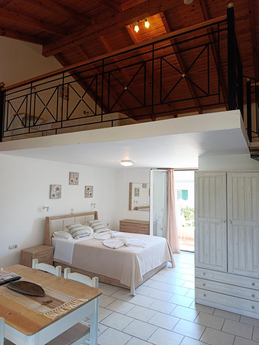Die neun Studios bestehen aus einem kombinierten Wohn-/Schlafraum, normalerweise mit zwei Einzelbetten. Die „Premiere Studios“ sind neuer und mit einem großen Doppelbett ausgestattet. Je nachdem, ob Sie oben oder unten buchen, überblicken Sie vom Balkon aus den Garten des Anna oder die Bucht von Arillas.