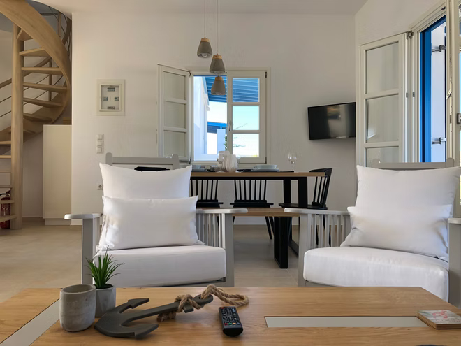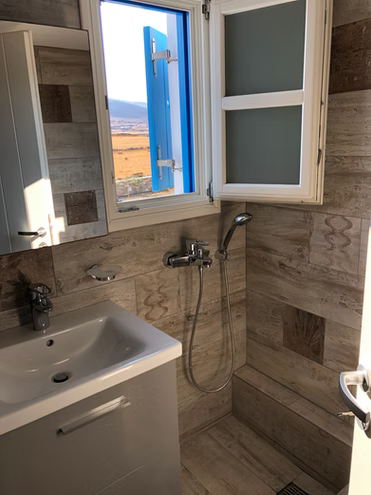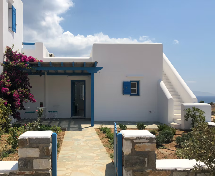 Die beiden neugebauten 2-Schlafzimmer-Maisonetten „Elizas Villa – Haus“ und „Mikes Villa – Haus“ sind ideal für Familien, die maximal empfohlene Belegung ist mit 4 Personen erreicht. Im Erdgeschoss befinden sich das Wohnzimmer mit dem Essbereich, die vollausgestattete Küche, ein kleines Bad mit Waschmaschine und WC sowie ein Eingangsbereich mit Kleiderschränken. Im Obergeschoss warten dann die beiden Schlafzimmer – eines mit Doppelbett, eines mit zwei Einzelbetten, das zentrale Bad – und die Terrasse auf Sie. Die Terrasse ist riesengroß und mit einem großen Tisch und Stühlen ausgestattet. Sie können von hier aus über den eigenen Garten und das Meer hinweg auf den östlichen Teil der Nachbarinsel Naxos schauen.