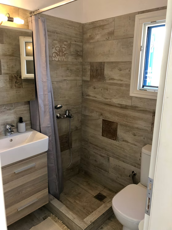 Die beiden neugebauten 2-Schlafzimmer-Maisonetten „Elizas Villa – Haus“ und „Mikes Villa – Haus“ sind ideal für Familien, die maximal empfohlene Belegung ist mit 4 Personen erreicht. Im Erdgeschoss befinden sich das Wohnzimmer mit dem Essbereich, die vollausgestattete Küche, ein kleines Bad mit Waschmaschine und WC sowie ein Eingangsbereich mit Kleiderschränken. Im Obergeschoss warten dann die beiden Schlafzimmer – eines mit Doppelbett, eines mit zwei Einzelbetten, das zentrale Bad – und die Terrasse auf Sie. Die Terrasse ist riesengroß und mit einem großen Tisch und Stühlen ausgestattet. Sie können von hier aus über den eigenen Garten und das Meer hinweg auf den östlichen Teil der Nachbarinsel Naxos schauen.